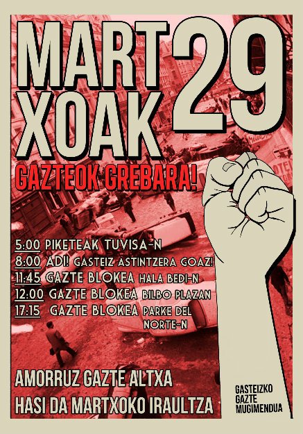 Gasteiz Antifaxista taldeak grebarekin bat egiten du eta egingo diren deialdietara atxikitxen da. Halaber Gasteizko hiritar guzitiei greban parte hartzera animatzen diegu, gure esku baitago egoera tamalagarri honi buelta ematea. Besterik gabe, espero dugu biharko greba inoiz abino arrakastatsuagoa izatea.