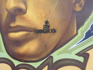 Alboka, encima de un graffiti,  nuevas pintadas nazis. Lo más repugnante son sus lemas, que son especialmente dirigidos a los inmigrantes. Lemas como "Stop inmigración" o "El látigo blanco contra los inmigrantes" se mezclaban con sus clásicos "Heil Hitler" o "Seig Heil". Todo esto decorado con esvasticas,  de un tamaño considerable y vistoso.